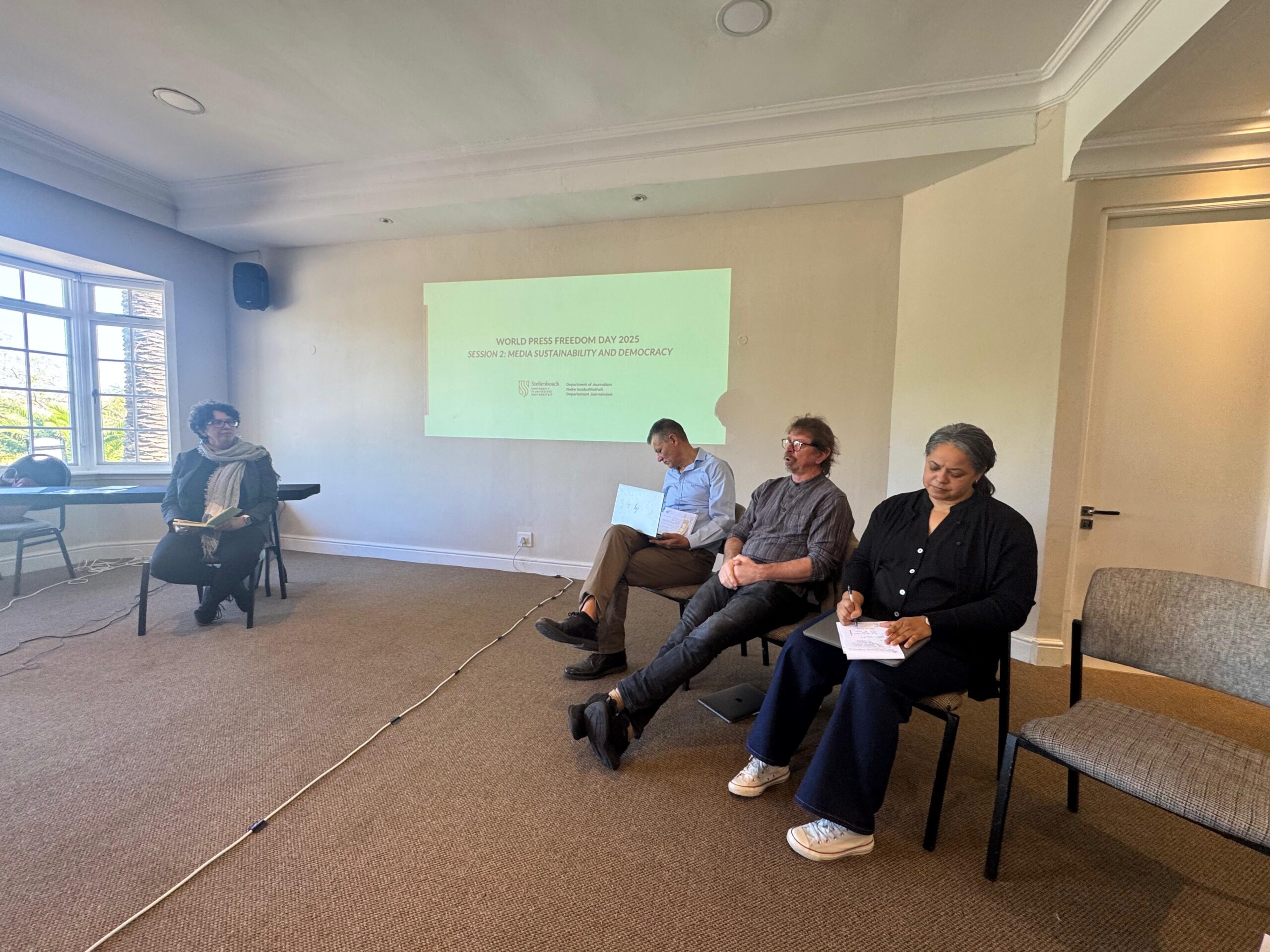 After a short break, the focus shifted in Session 2 to “Media Sustainability and Democracy,” chaired by Anneli Groenewald. This session included a recorded presentation from Edward Hurcombe of RMIT University in Australia, followed by a vibrant panel discussion. Kenneth Makatees (SABC), Sam Sole and Lizel Shepherd (Amabhungane) shared firsthand insights into how journalistic institutions navigate the fine line between editorial independence and financial constraints.